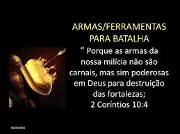 Pensamento Bíblico: Poderosas Armas de Guerra (2 Coríntios 10:1-6). Paulo tinha se envolvido de certo modo no conflito entre os irmãos de Corinto e, neste trecho, ele os confirma sobre o motivo e a firmeza de sua batalha contra o mal. Seu motivo era o amor (veja 2 Coríntios 11:11). Sua firmeza era o poder de Deus. Ele não se envolveria em batalhas carnais com armas carnais. Paulo usaria as armas que todo cristão deve empregar. Nossas batalhas são contra aquelas coisas que exaltam a si mesmas diante de Deus e nossa vitória é assegurada se nós continuarmos a batalha com as armas que Deus produziu (veja Efésios 6:10-20).